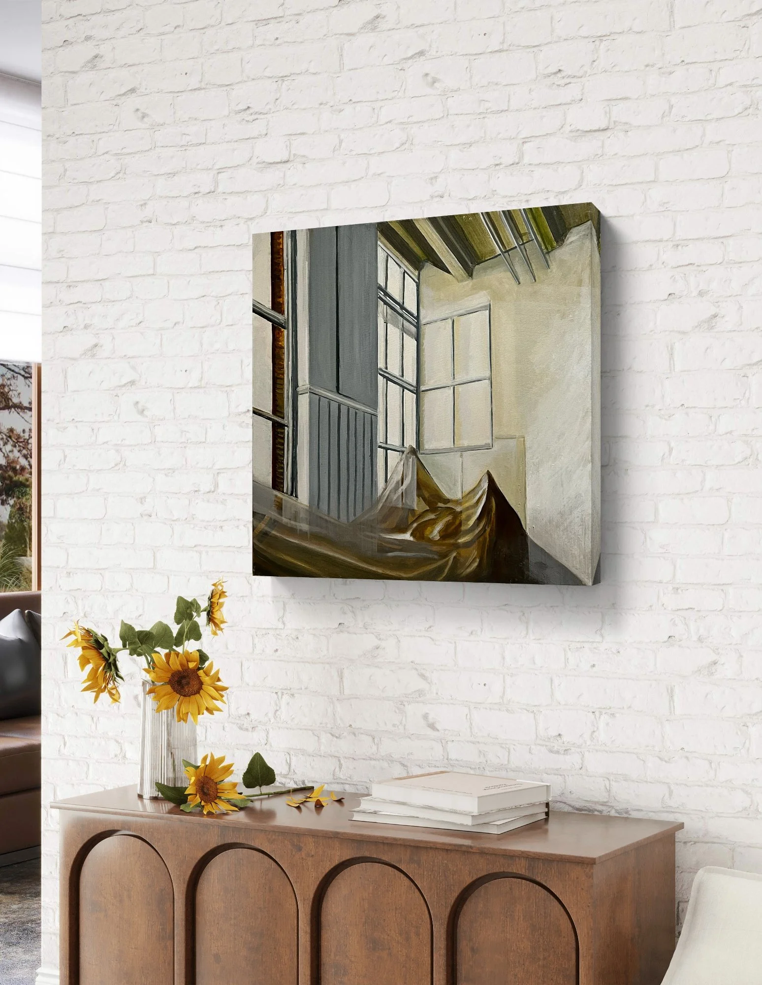 This painting explores and reconnects with lost interiors that convey a connection with place; the atmospheric interior, memory whilst exploring the nature of sound properties. This painting is from the interior of Edinburgh School of Art and the last publicly open degree show before the Pandemic forced museums, galleries and institutions to close to the public.